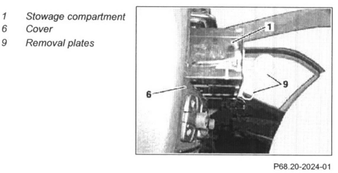 2 Pull stowage compartment (1) of cover (6) out with removal plates (9)