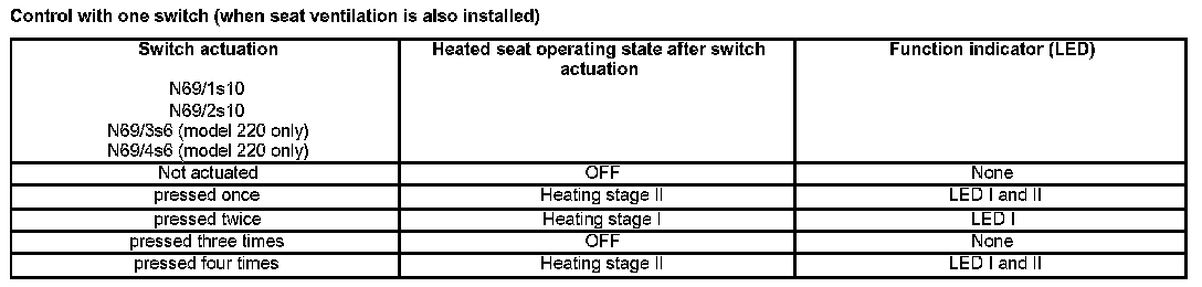 The heated seats can be controlled with two switches in the associated door control module. If seat ventilation is also present, control is accomplished with one switch. The second switch then serves for control of the seat ventilation. The heated seats have two heating stages. Heating in stage 2 is possible for a maximum of 5 min. After approx. 5 min. the left front seat adjustment control module with memory (N32/1)/right front seat adjustment control module with memory (N32/2)/rear seat control module (N25/6, nur Typ 220) automatically switches back to heating stage I. The heated seat is then switched off completely after another 30 minutes. The time control continues to run for t=5 min. after switching off 15 R. If c. 15R or c. 15 is switched on during this period, the heated seat is switched back on in the heating stage active in the time control.