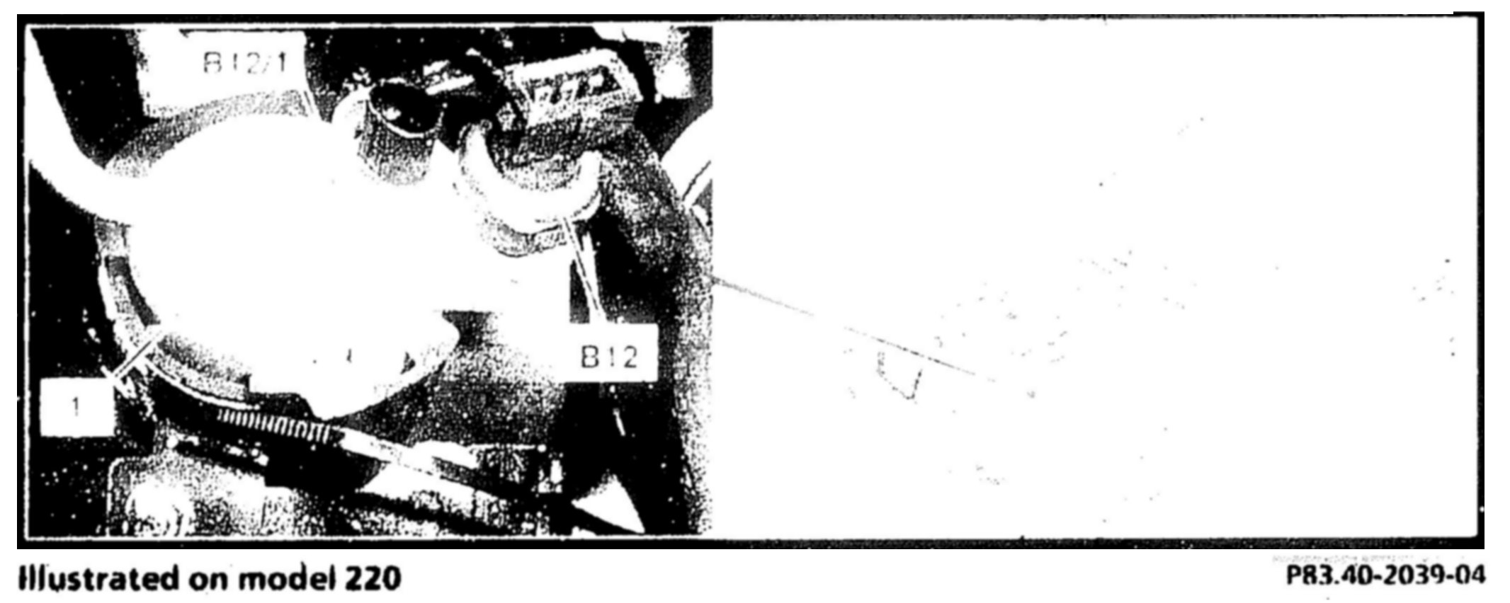 The refrigerant pressure sensor (B12) is located on the receiver/drier (1) in the engine compartment at the front left.