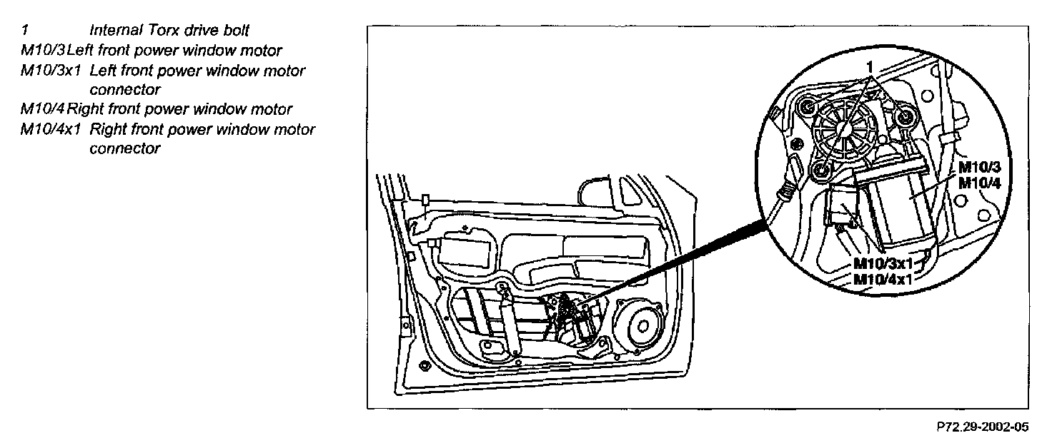 5 Remove left/right power window motor (M10/3, M10/4) from power window and door