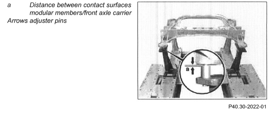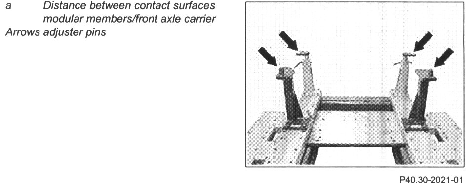 NOTE: The adjuster pins (arrows) on the modular member must be inserted into the reference bores in the front-axle carrier.