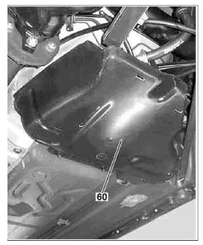 At frame floor on left anhead of rear axle.