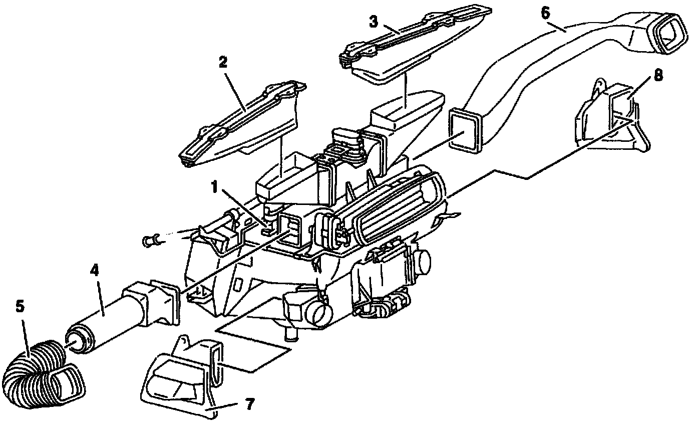 The air ducts for the defroster nozzles (2 and 3) are located at the top of the automatic A/C housing (1) and are integrated into the instrument panel.