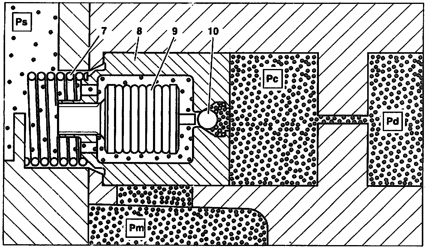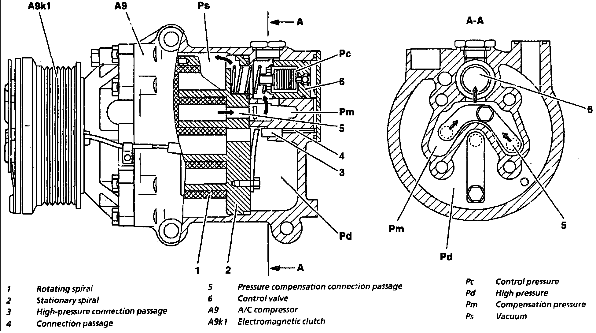 If the power required is high in relation to the A/C compressor drive speed and if the intake vacuum (Ps) is higher than the specified value, the bellows valve (9) retracts. This causes the ball valve (10) to close and the control pressure (Pc) at the top of the piston increases. The increasing pressure difference on the piston (8) moves it against a spring (7) closing the connection passage between the high pressure side (Pd) and the intake vacuum side (Ps). The A/C compressor then operates at maximum output.