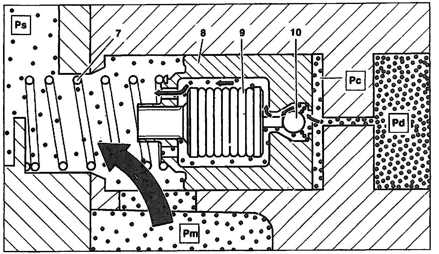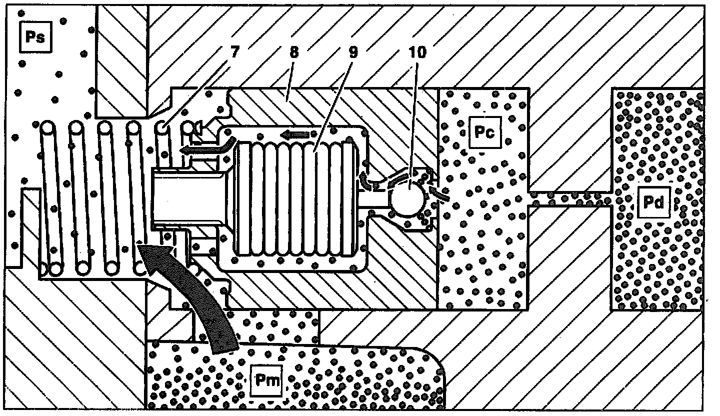 If the output required is minimal in relation to the A/C compressor drive speed, the bellows valve (9) expands to the maximum size. The control pressure (Pc) at the top of the piston is reduced as far as possible and the piston (8) completely opens up the connection passage cross section. The A/C compressor then operates at minimum output.