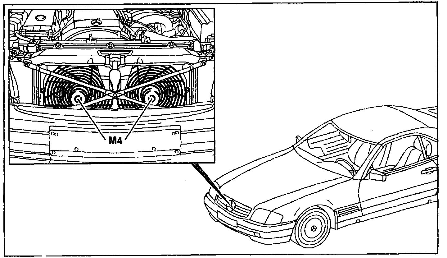 The auxiliary fans (M4) are located behind the radiator grille immediately in front of the radiator.