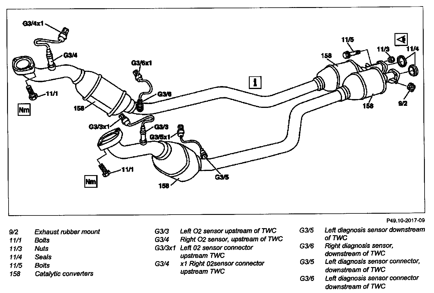 2 Unscrew bolts (11/5) with nuts (11/3) at flange connection between front exhaust system/rear exhaust system