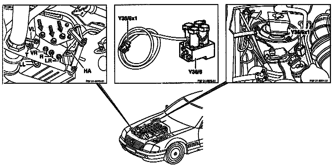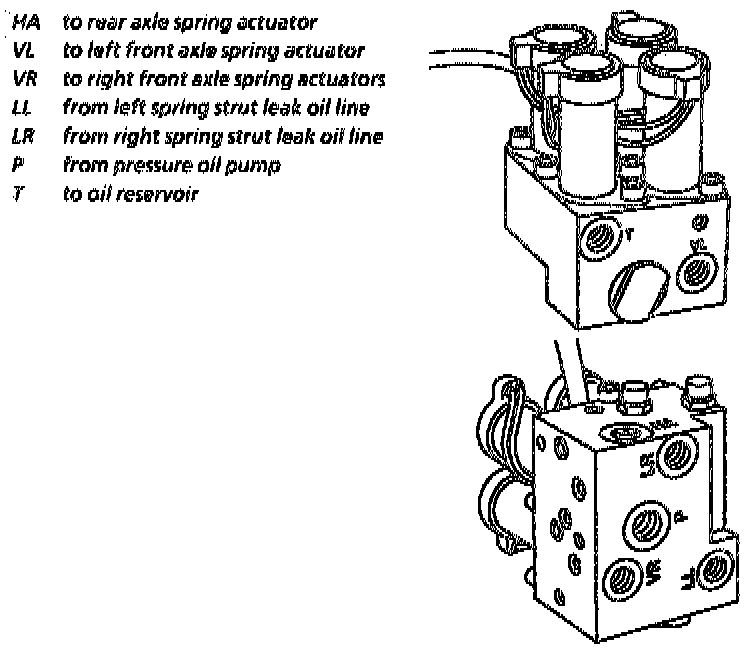 2. Disconnect pressure lines (HA, VR, VL, LL, LR, P and T) at rear axle height reduction valve
