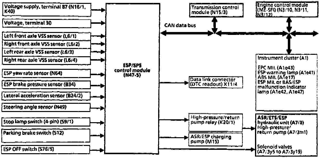 The signals of wheel speeds, steering angle, yaw of the vehicle, lateral acceleration as well as the brake pressure of the front axle circuit are recorded and processed by a vehicle condition controller in the ESP control module (N47-5). After evaluating the input signals, the charging Pump (M15), pressurizing solenoid valves, switchover valves, high-pressure pump/return pump (A7/3m1) as well as the required solenoid valves are actuated in order to control the brake pressure in the individual wheel brakes.