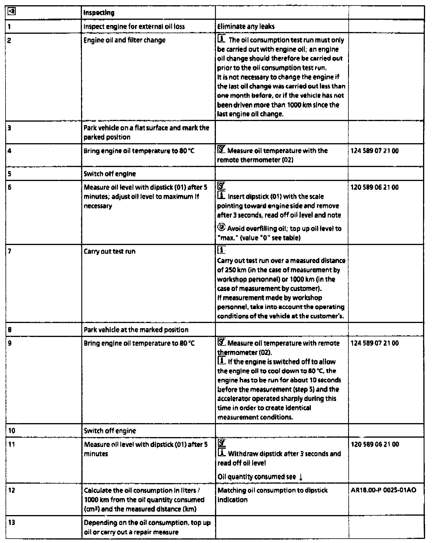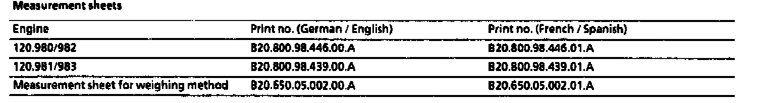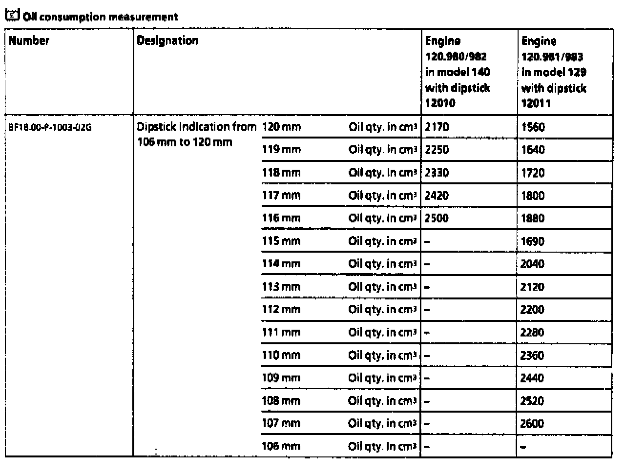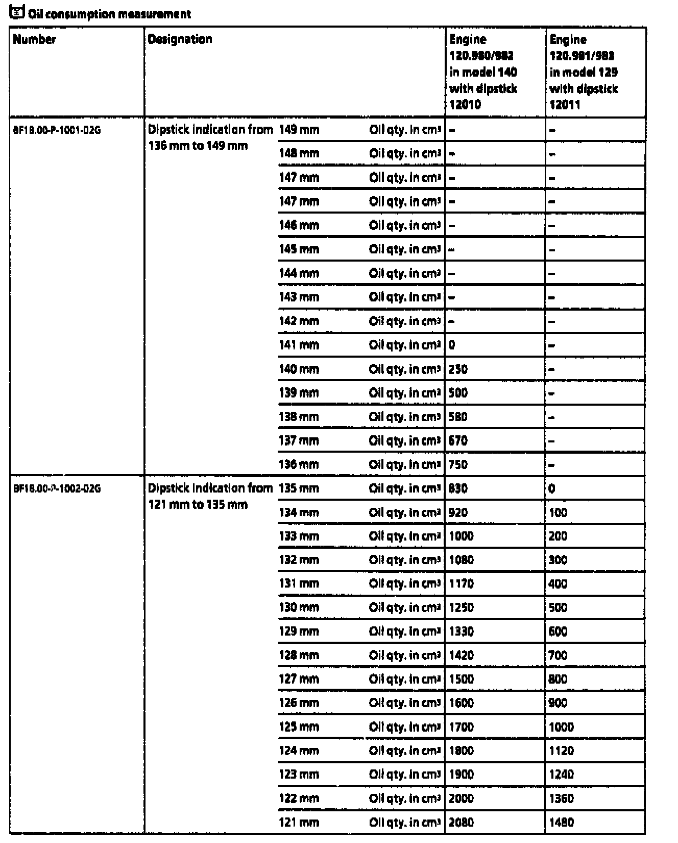 Engine oil is topped up prior to the test run to "max." = 141 mm (value "0" see table engine 120.980/982). After the test run (measured distance 750 km) the indication read off on the dipstick is 139 mm results in a difference of 500cm(3).