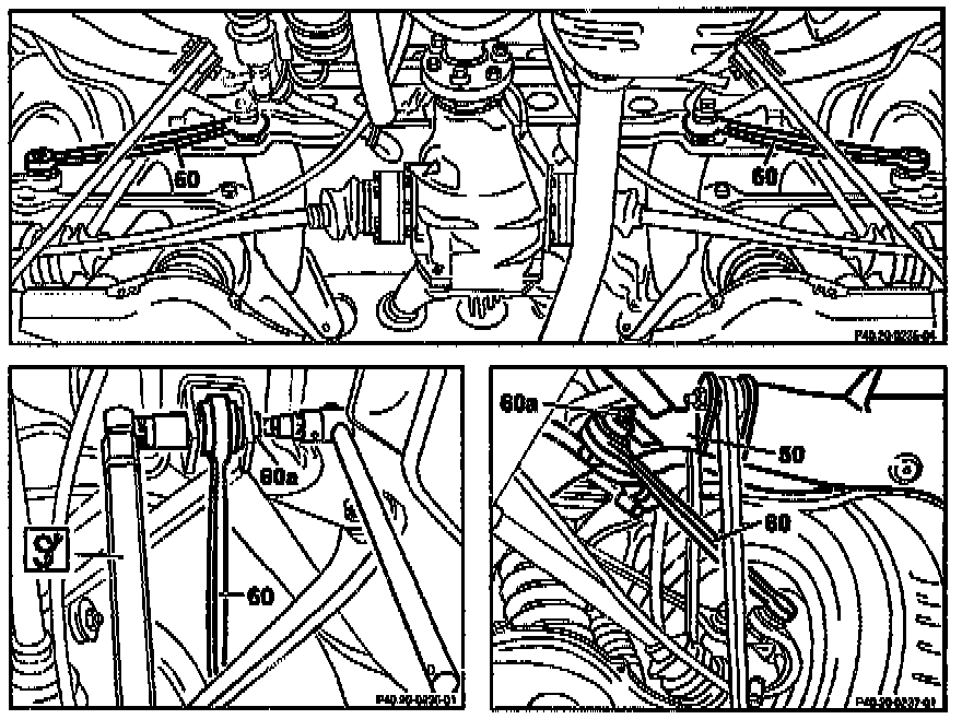 2. Adjust toe-in at rear axle carrier (50) using the cam bolt (60a) on the mount of left and right track rod (60)