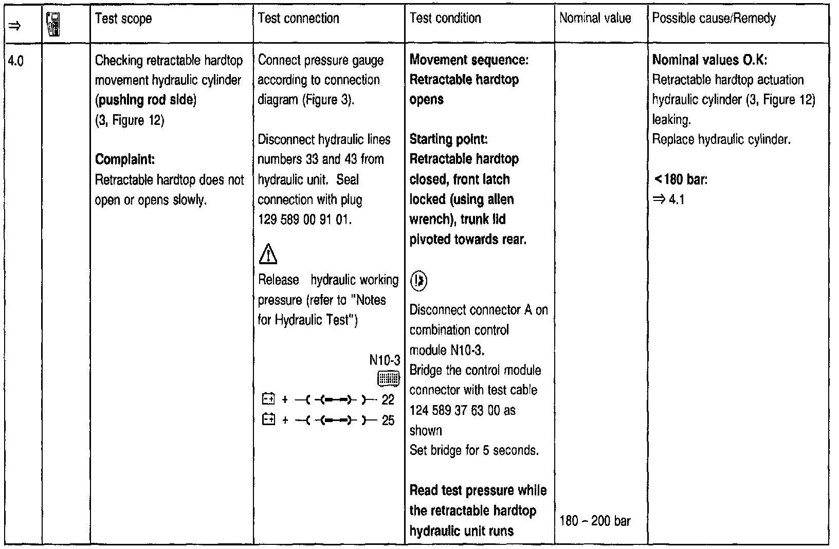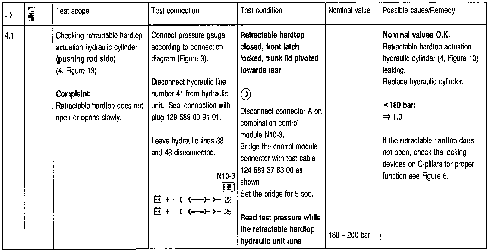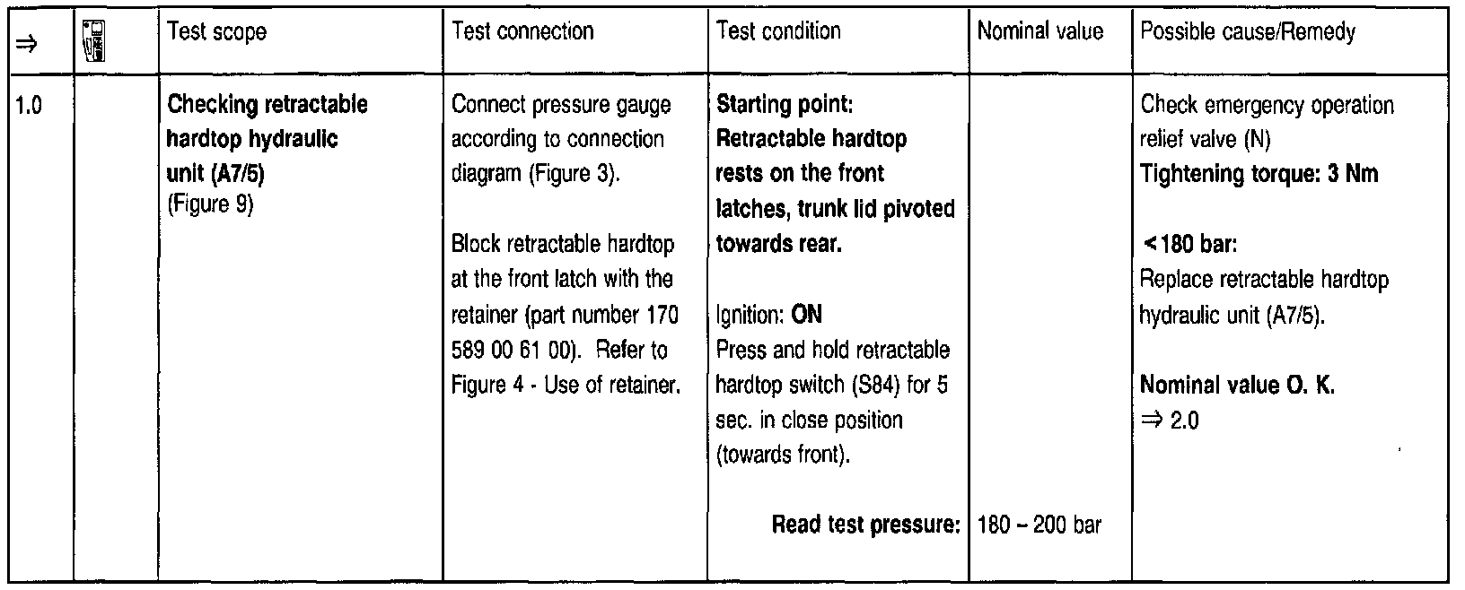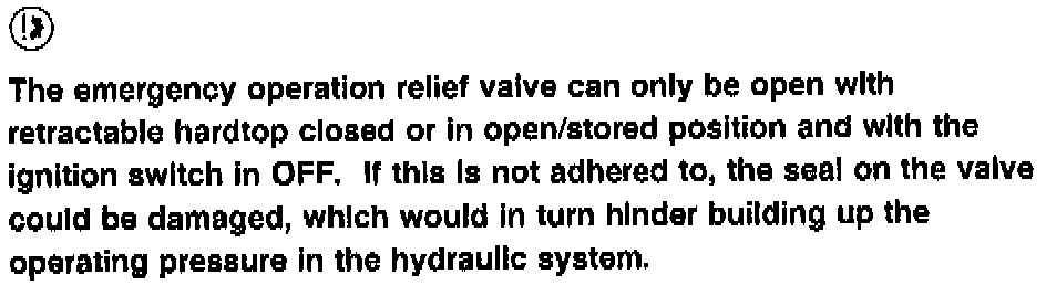 In order to move the retractable hardtop manually, the emergency operation relief valve on the hydraulic unit must be open all the way to a stop position using the allen wrench provided with the vehicle, refer to "N" in Figure 3). The emergency operation relief valve must be then closed (tightening torque approx.: 3 Nm).
