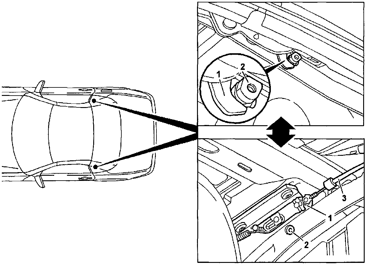 2 Move retractable hardtop all the way until it is blocked by the retainer (1).