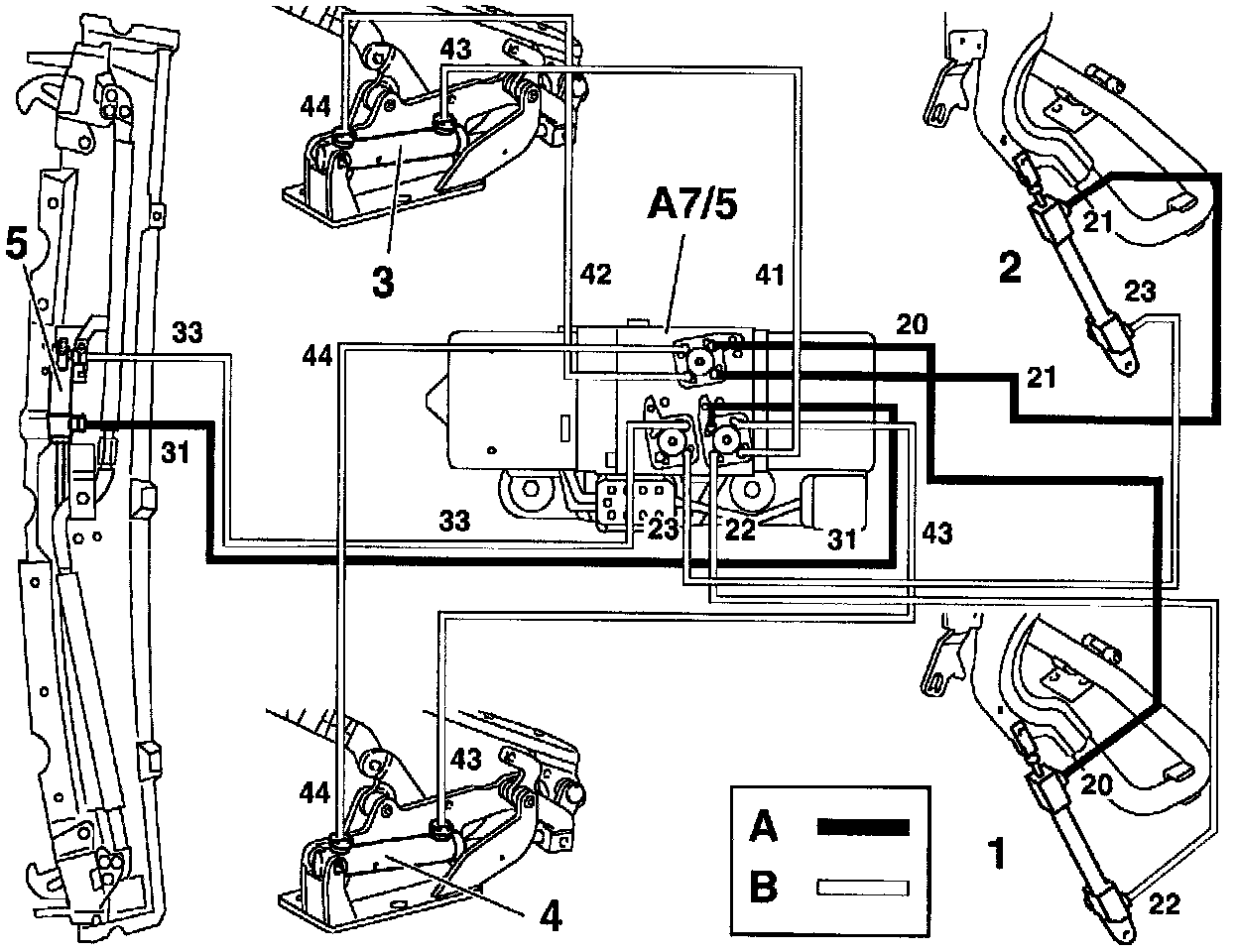 4 Retractable hardtop, right actuation hydraulic cylinder 5 Front hydraulic lock cylinder