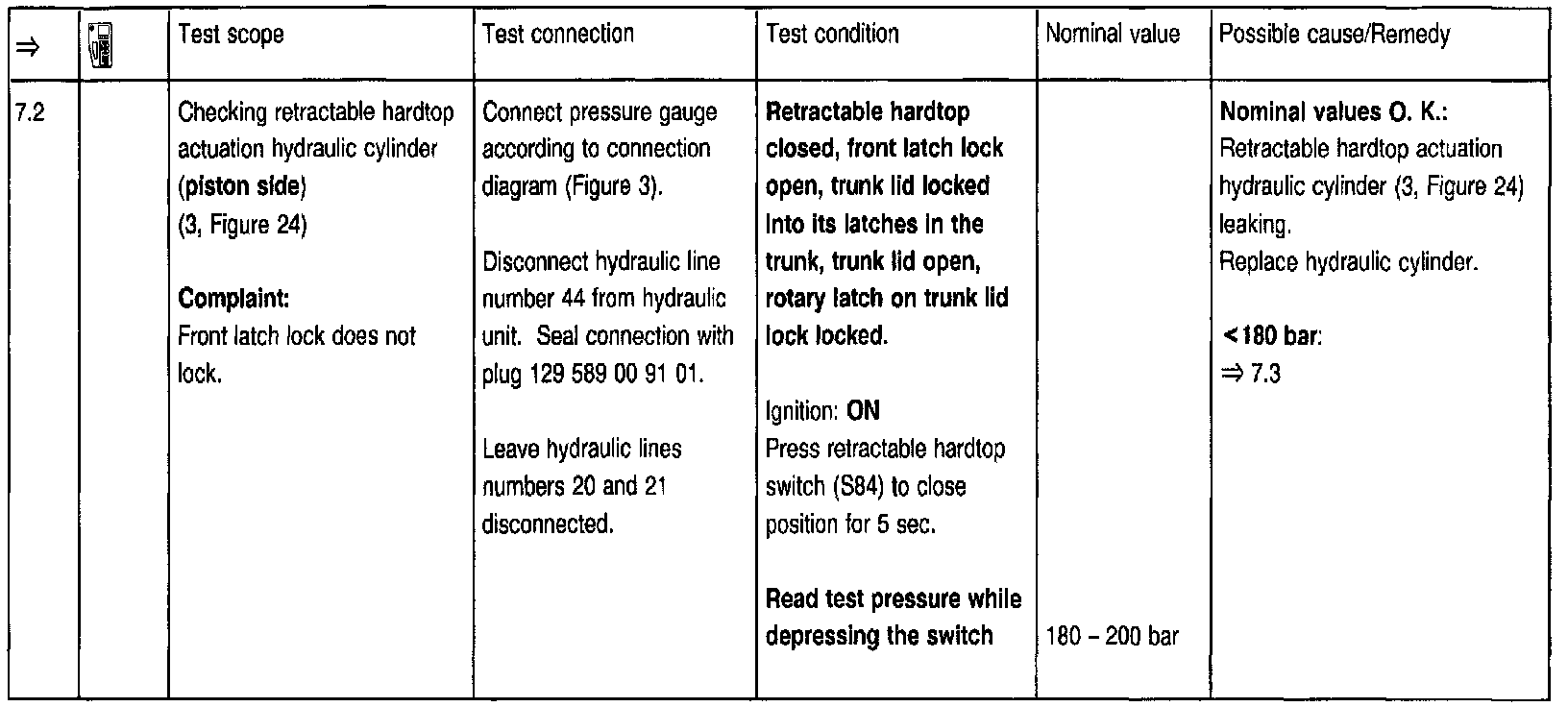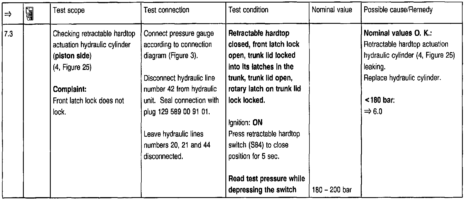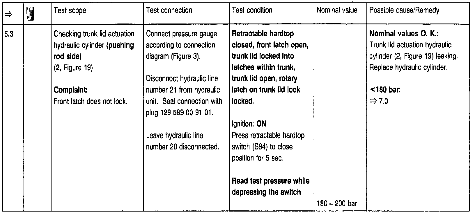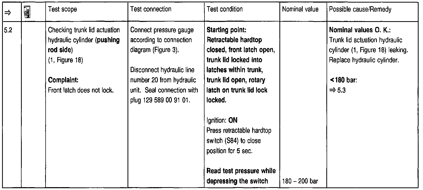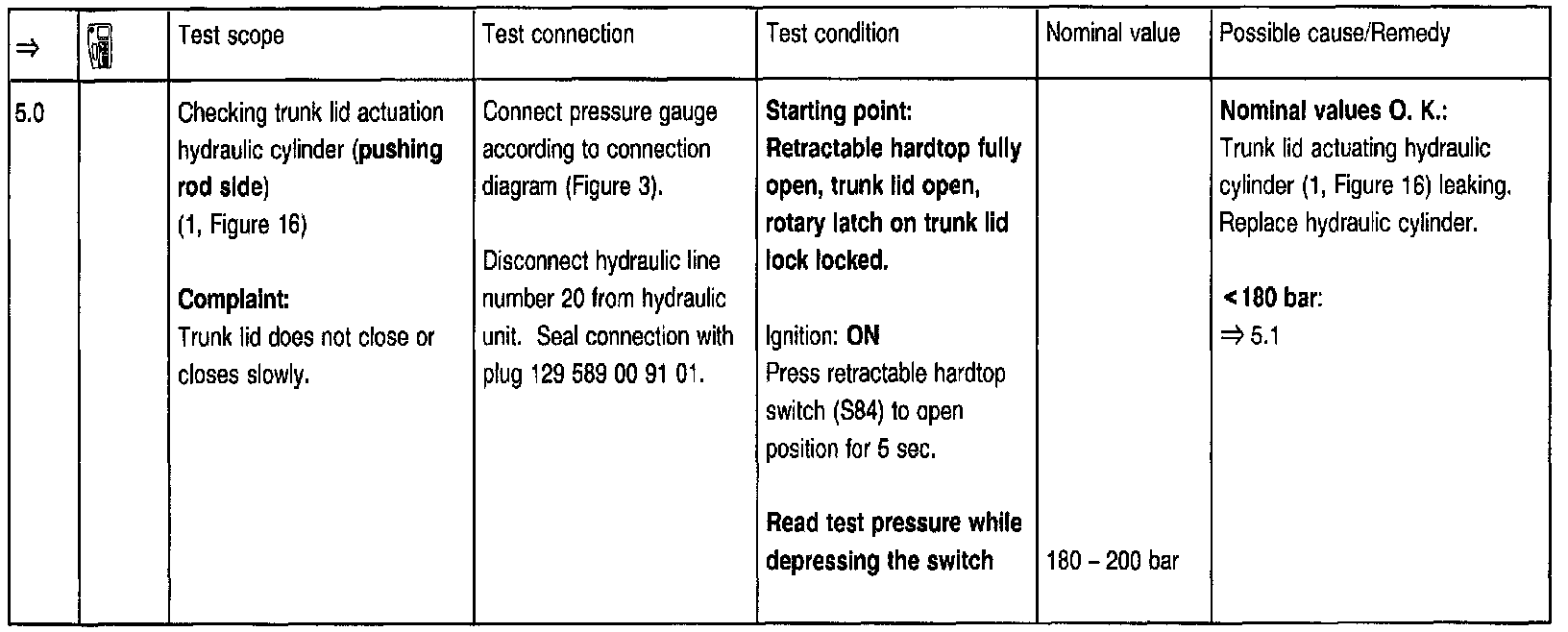 To use the pressure gauge after setting the hardtop to the desired position at the test steps => 2.0, 3.0, 5.0, 5.1, 5.2, 7.0, 7.1, 8.0, 8.1, 8.2, 8.3, 8.4, the trunk lid must be open via trunk lid lock and the rotary latch moved (using a small screwdriver) to a locked position. Before closing the lid, the rotary latch open position must be restored by pressing the lock button.
