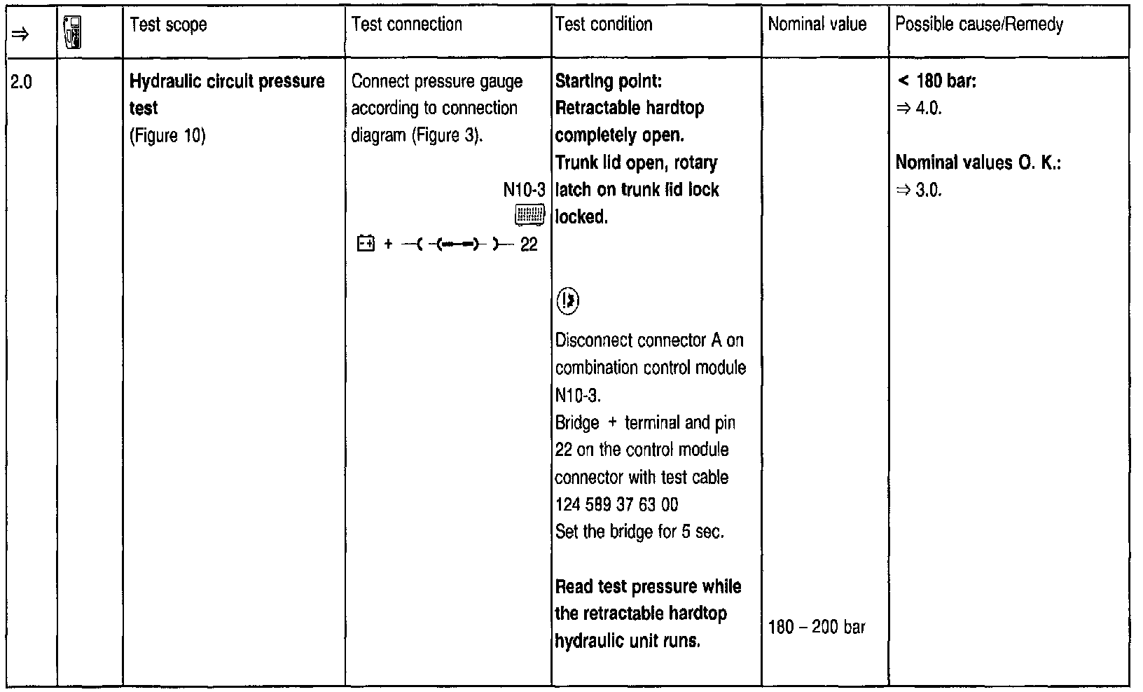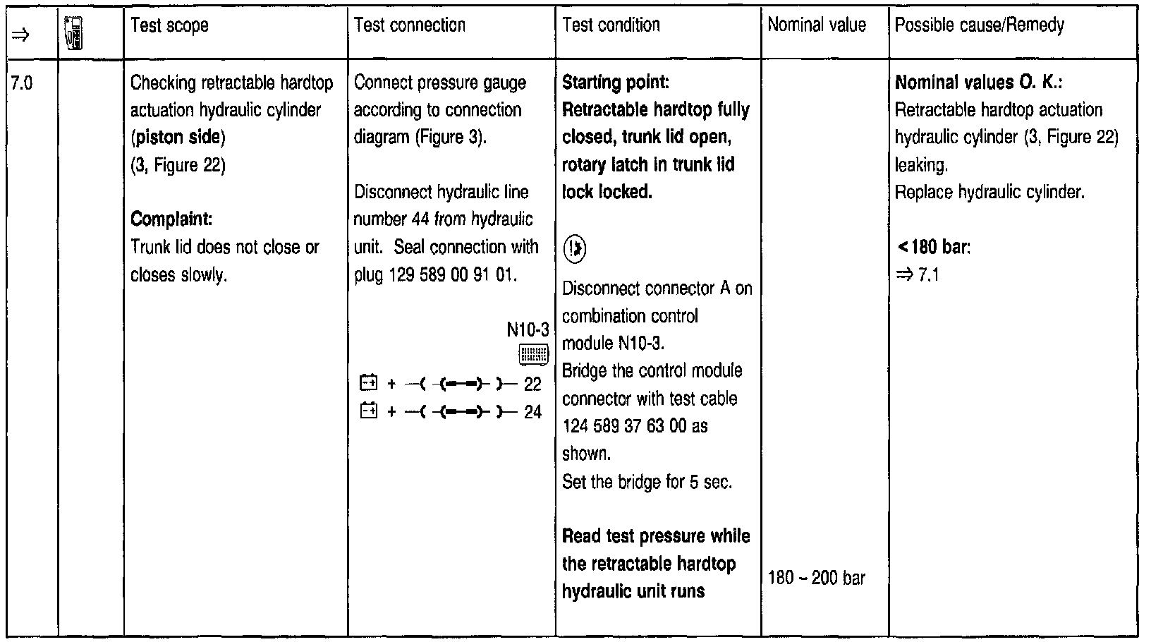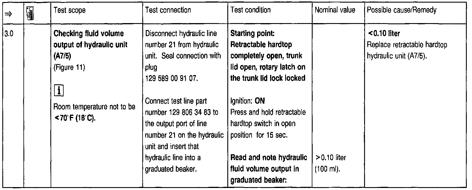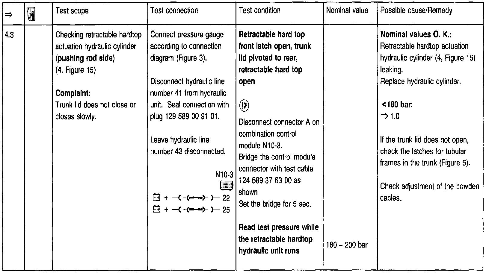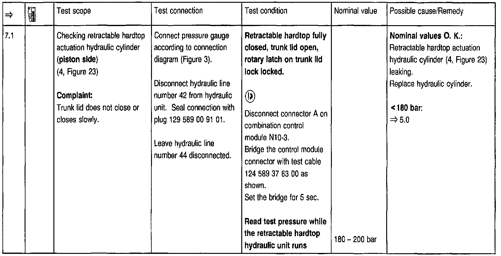 To use the pressure gauge after setting the hardtop to the desired position at the test steps => 2.0, 3.0, 5.0, 5.1, 5.2, 7.0, 7.1, 8.0, 8.1, 8.2, 8.3, 8.4, the trunk lid must be open via trunk lid lock and the rotary latch moved (using a small screwdriver) to a locked position. Before closing the lid, the rotary latch open position must be restored by pressing the lock button.
