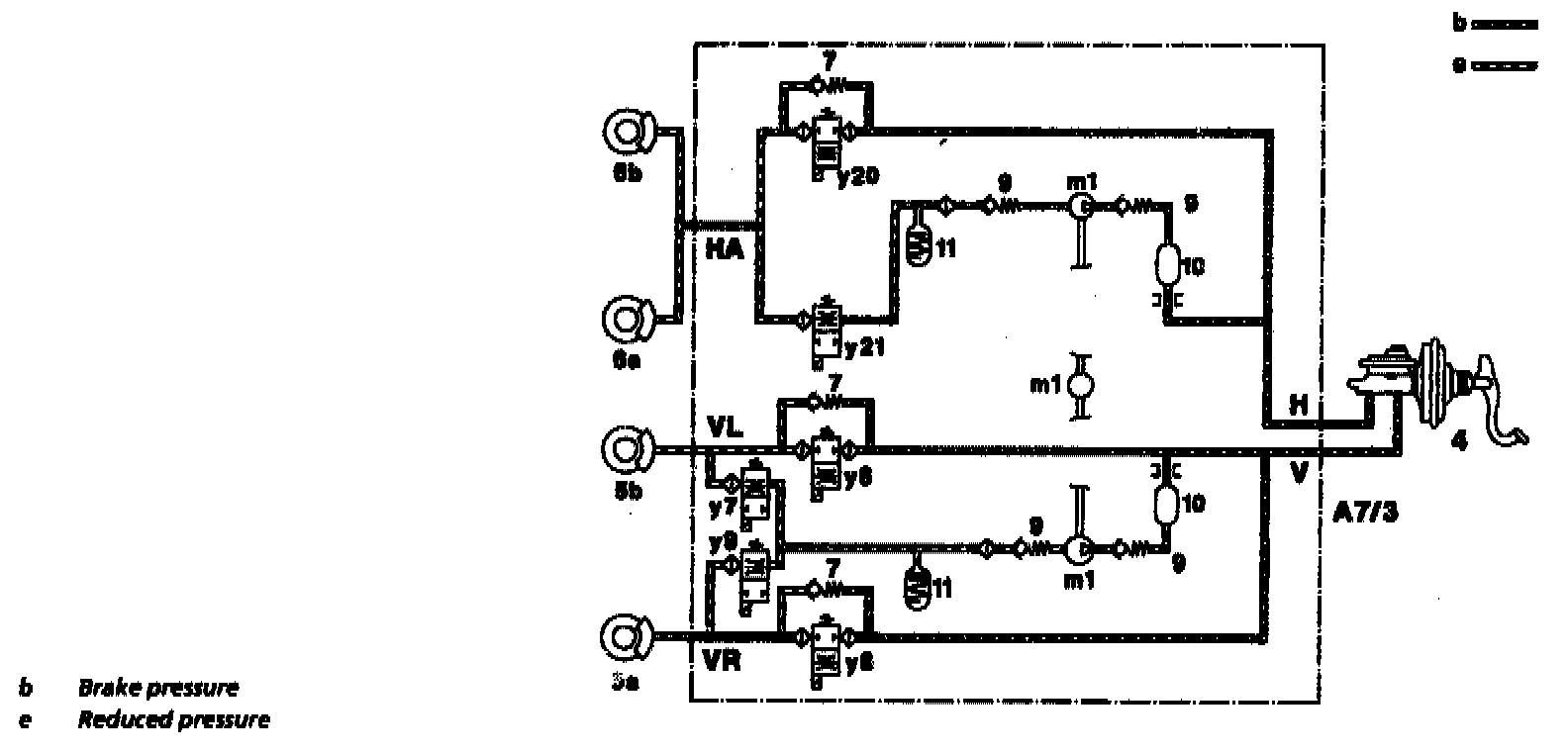 The ABS control module derives the pressure reduction phase from the wheel Weds and sill; values. The pressure reduction phase is introduced by actuating (opening) the solenoid valves (y7, y9 and y21). The solenoid valves (y6, y8 and y2O) remain actuated (closed) in this control phase.