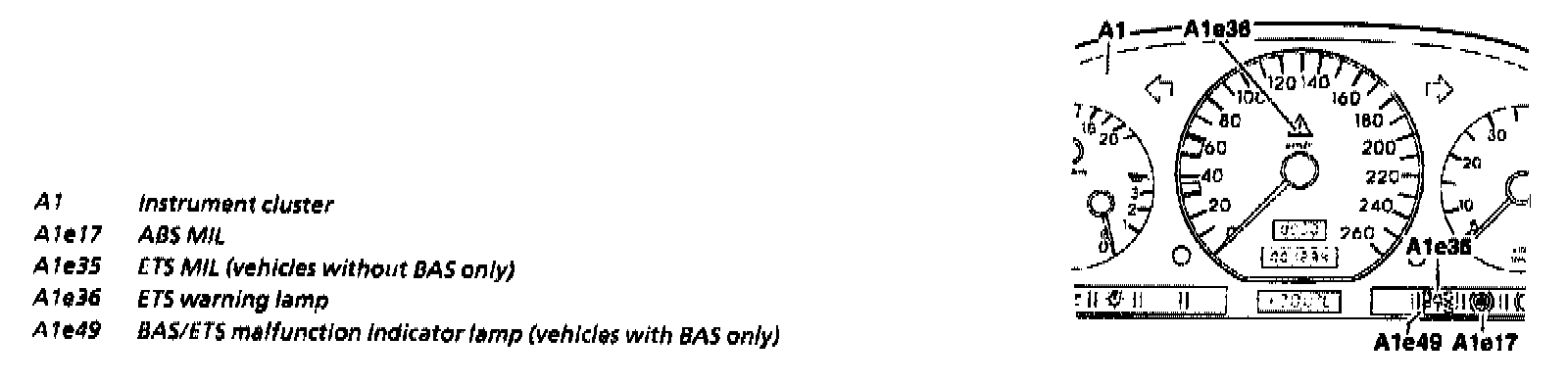 If the ABS and BAS/ETS, malfunction indicator lamps come on when the engine is running, there is a fault in at least two control circuits and at least two systems are switched off. The BAS function can be retained despite the ABS, and ETS being switched off.