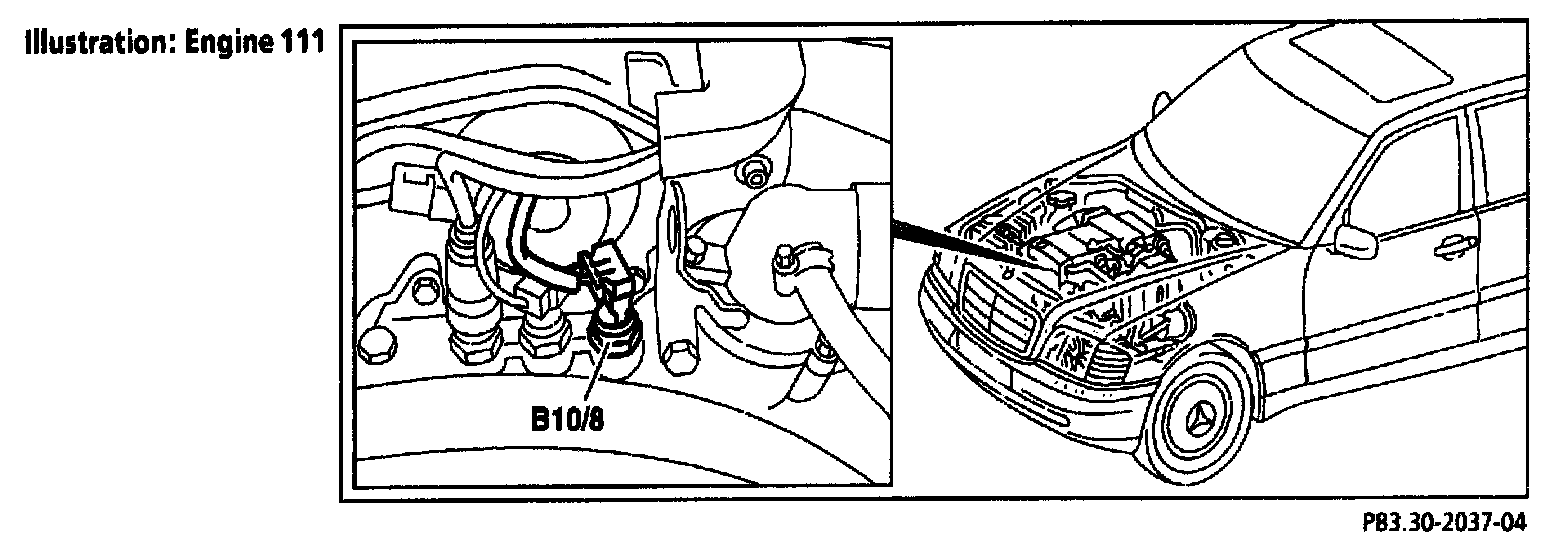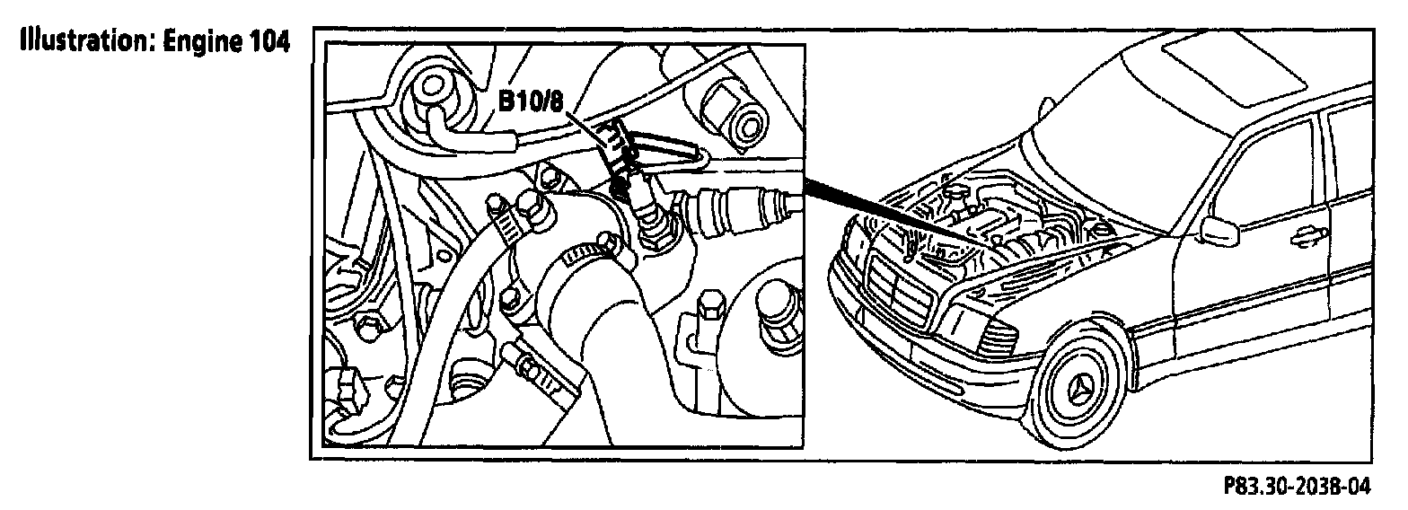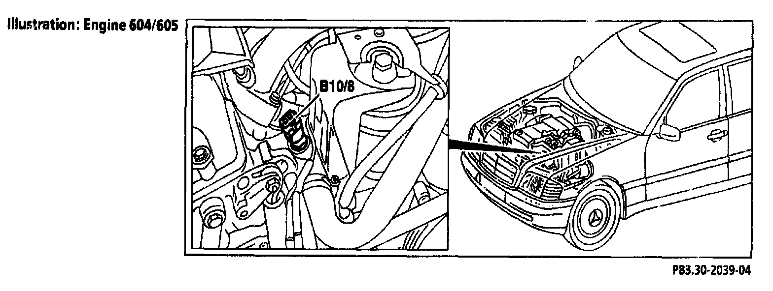 The A/C engine coolant temperature sensor (B10/8) is located at the front left on the cylinder head in the vicinity of the fuel filter.