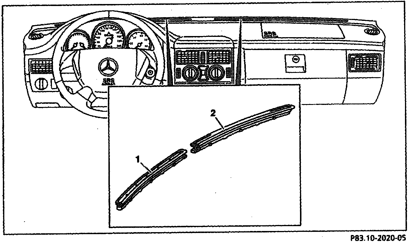 The windshield defroster nozzles (1, 2) are located below the windshield in the instrument panel.