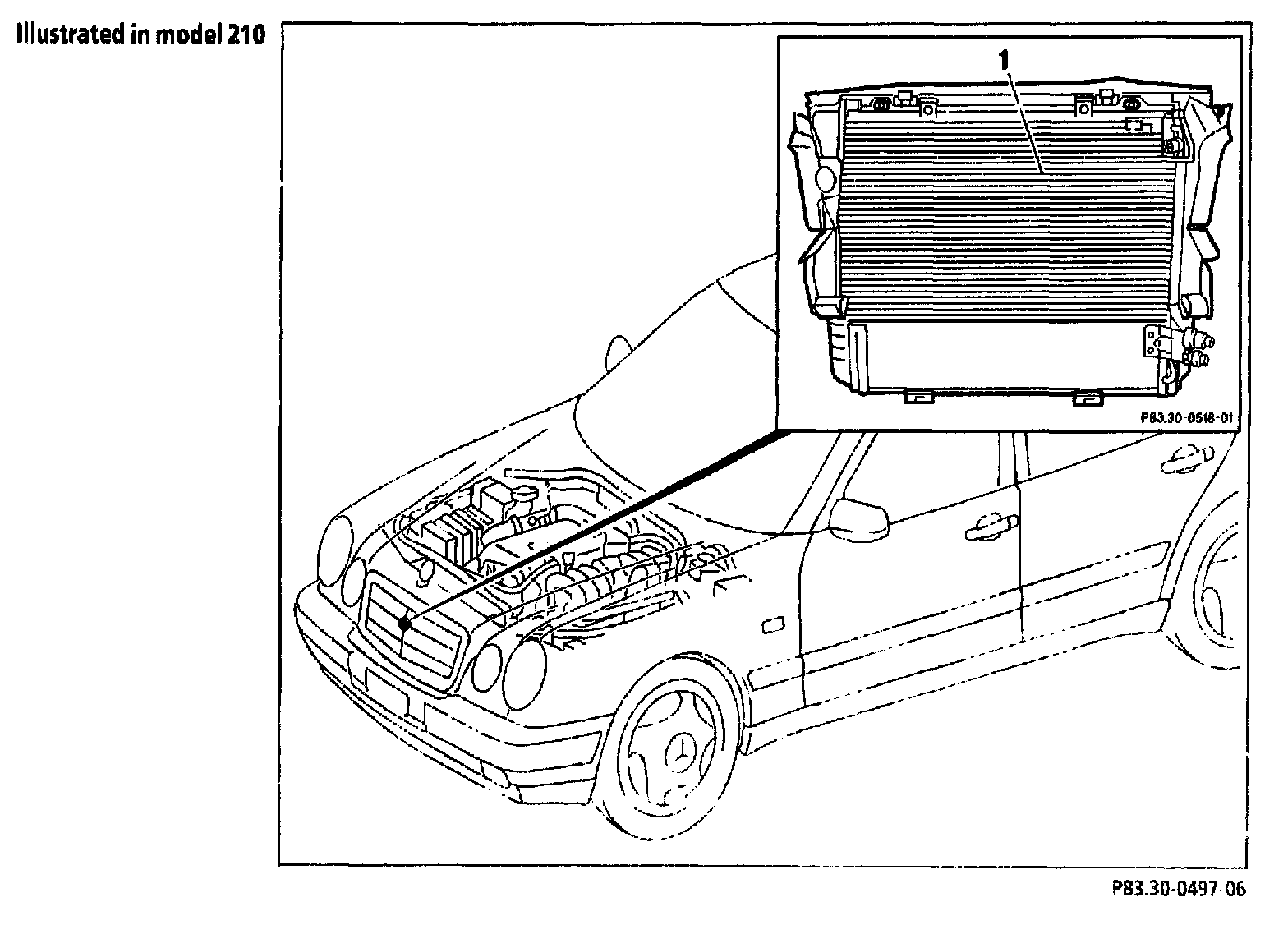 The condenser (1) is located behind the radiator grille directly in front of the radiator.