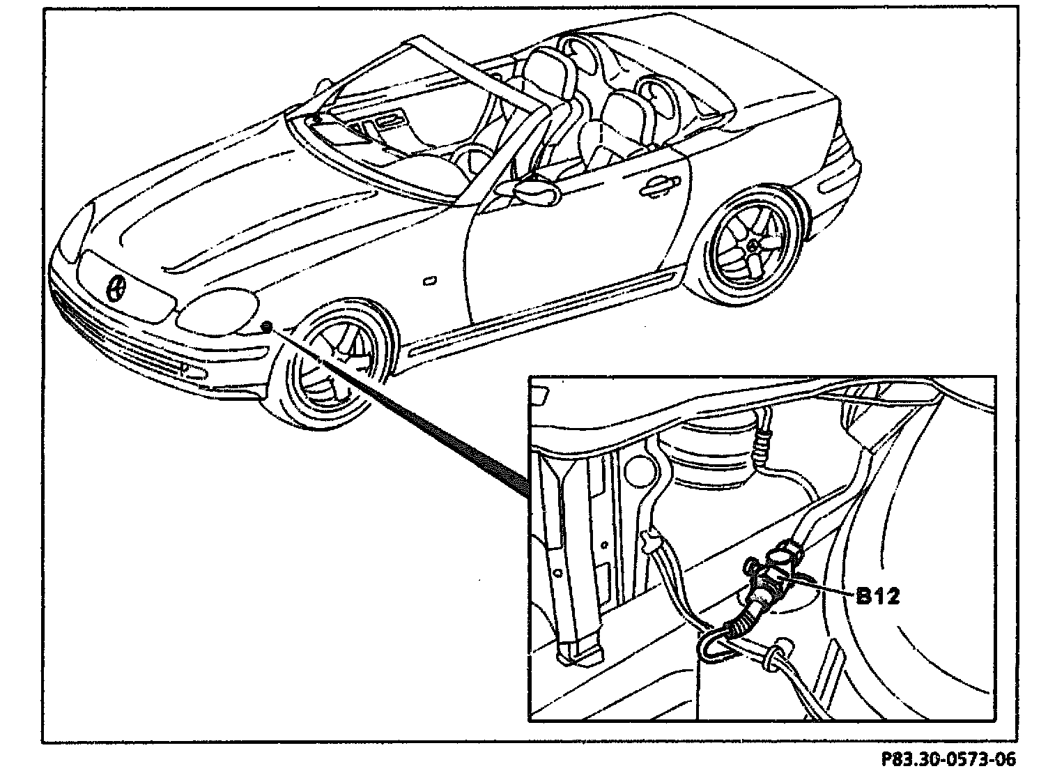The refrigerant pressure sensor (B12) is located at the front left in the engine compartment.