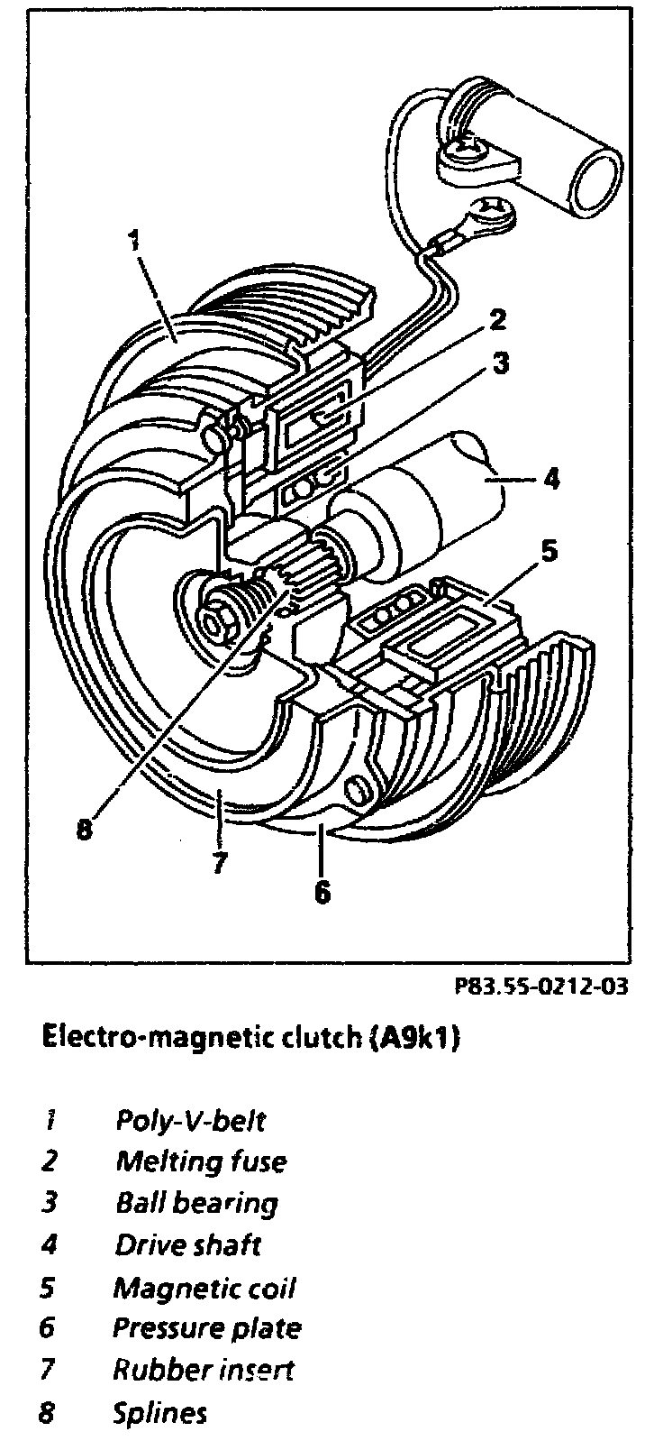 The electromagnetic clutch disengages automatically in order to prevent damage to the poly-V-belt in the event of a mechanical defect in the A/C compressor. In the event of a mechanical defect the A/C compressor is hard to turn or even locked up completely. The heat resulting on the friction surface causes the melting fuse (2) in the magnetic coil (5) to melt The electrical power to the magnetic coil (5) is interrupted interrupting the power flow.