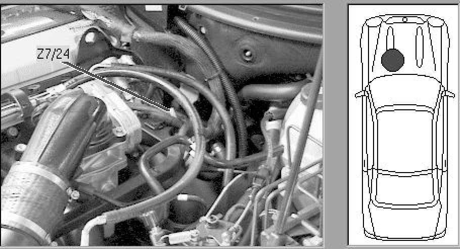 Left rear of engine, at rear edge of plastic harness tray