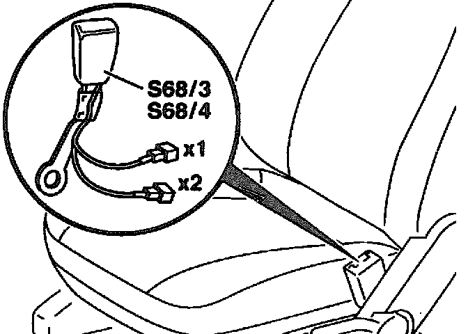 The seat belt buckle switch (S68/3 and S68/4) is an element of the seat belt buckle and is firmly integrated into the buckle. The connection to the emergency tensioning retractor with airbag control module is created through the connector (S68/3x1and S68/4x1) at the seat belt buckle.