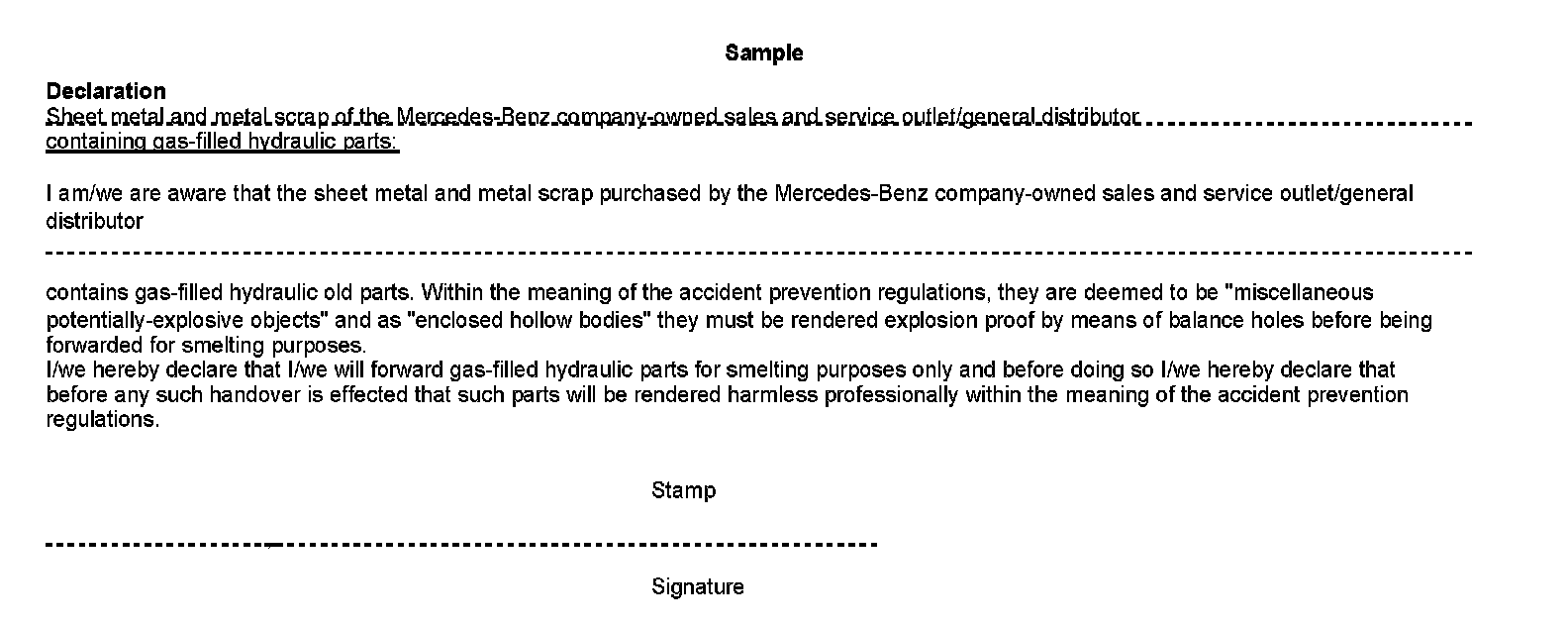 The scrapping of gas-filled hydraulic parts can also be handed over to a scrap dealer who carries out the required safety measures. If accepted, the scrap dealer must sign an official declaration (see sample), in which he/she is bound to scrap gas filled hydraulic parts in accordance with the respective valid accident prevention regulations.