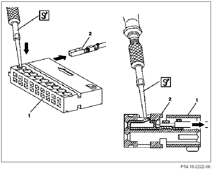 14 Press the spring shackle of the female contact (2) downward and push the female contact (2) out of the contact cavity of the connector housing (1). Tug the corresponding cable at the same time to assist the unpinning procedure.