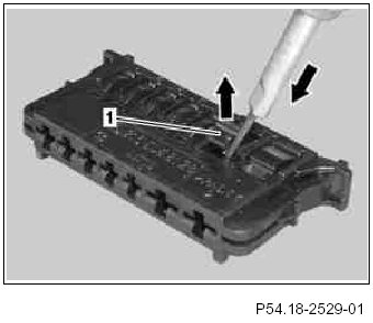 1 Using a suitable tool, at the line side unlock the lugs (1) on lock tab.