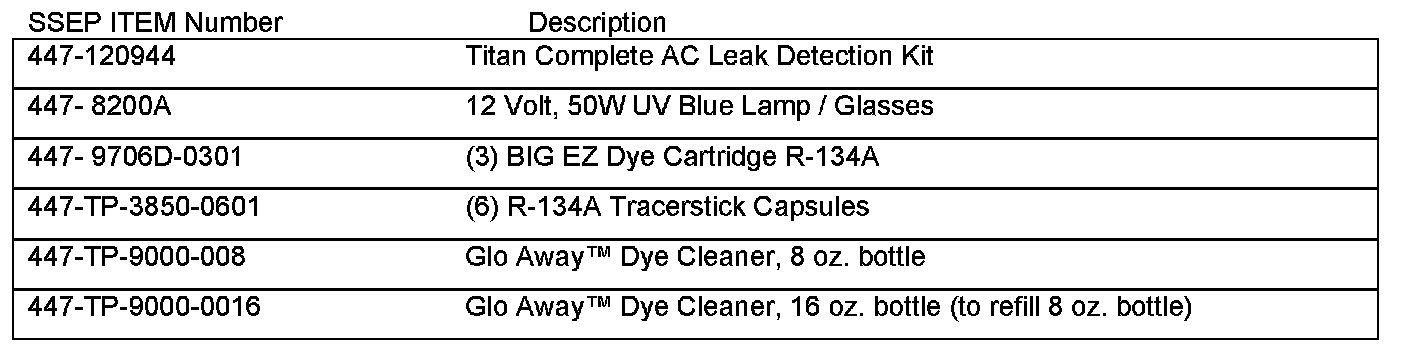 In order to ensure compatibility with all components and materials in the AC system the only approved tracer dye additive to be used is manufactured by Spectronics Corp. /Tracer Products. If other products are used, warranty submissions could be subject to debit.