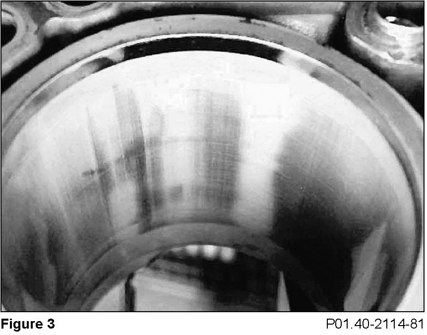 Starting from the first piston ring, tapering to an end about 3Omm. Traces of dry rubbing which can be felt, caused by oil film being washed off by fuel, e.g. during frequent cold starts in short distance driving. These traces of rubbing which occur principally in the of the cylinder head bolts and on the pressure side are not a problem, provided they are smooth and piston rings are not damaged.
