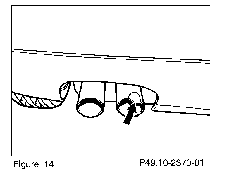 The occurrence of airflow or hissing noise usually indicates a condition with the bodywork of the vehicle (airstream / aerodynamics). However, it may also be caused by a slightly crushed/deformed rear muffler tailpipe or by the exhaust being pushed forward (towards the front of the vehicle) by contacting a foreign object when reversing or otherwise bumping/contacting the exhaust system (arrow, Figure 14).