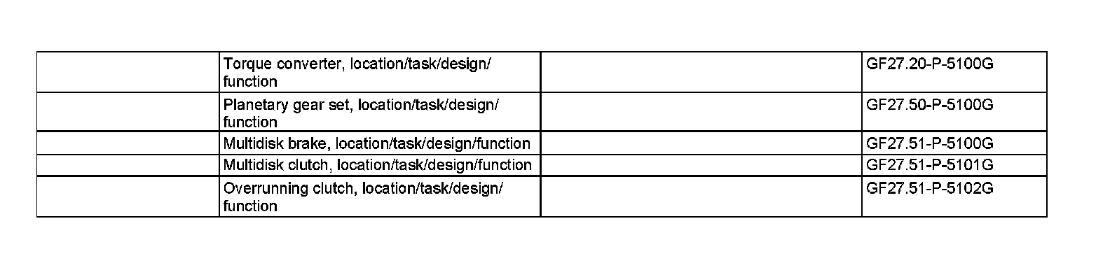Torque from the torque converter is increased via the propeller shaft (1) and all three planetary gear sets and transferred with reversed direction of rotation to the output shaft (5).