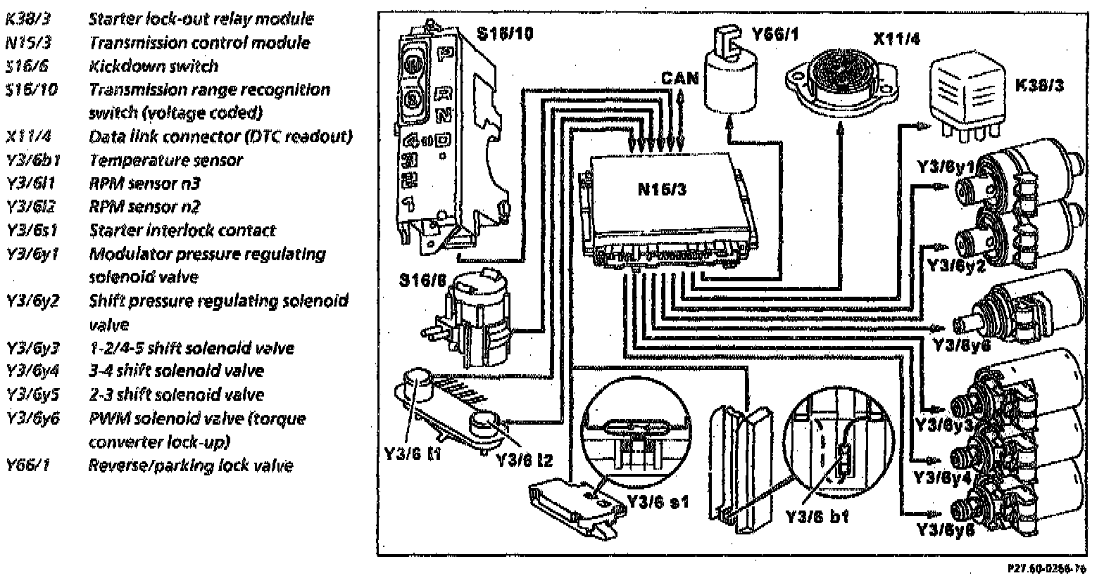 The transmission control module (N15/3) receives operating data as input signals from various sensors and switches. In addition there is a connection to the engine control module and the control modules of the various chassis systems (e.g. ABS, ASR) via the CAN bus.
