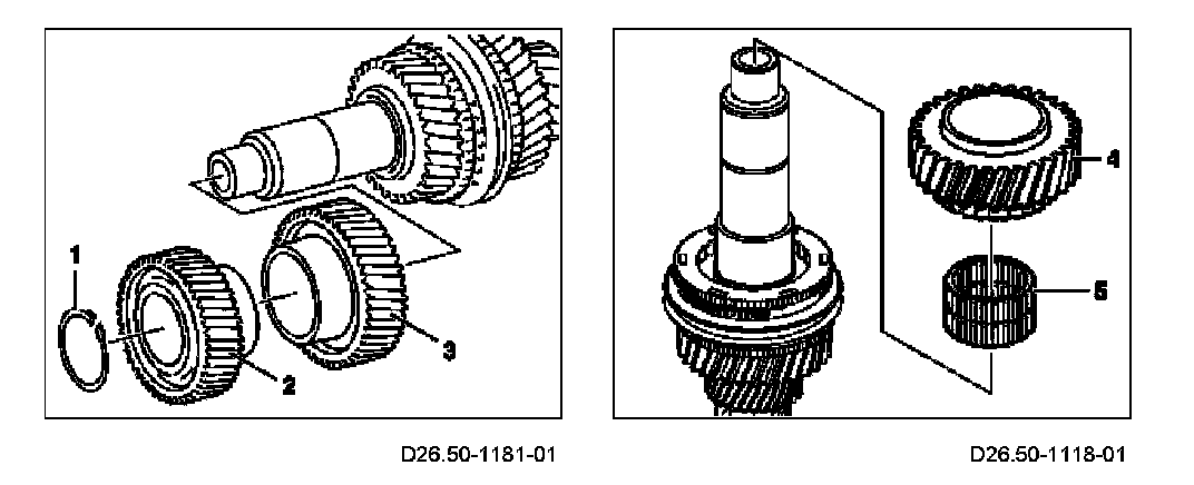5 Detach 3rd gear idler gear (4) and 3rd gear needle roller bearing (5).