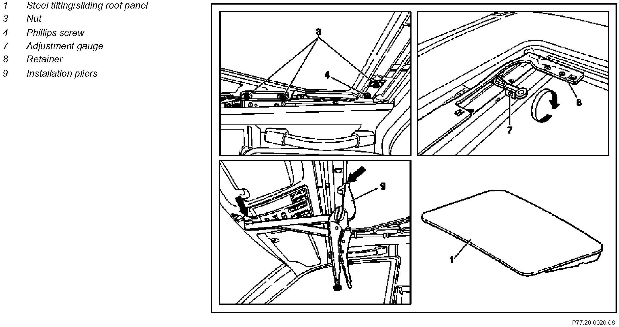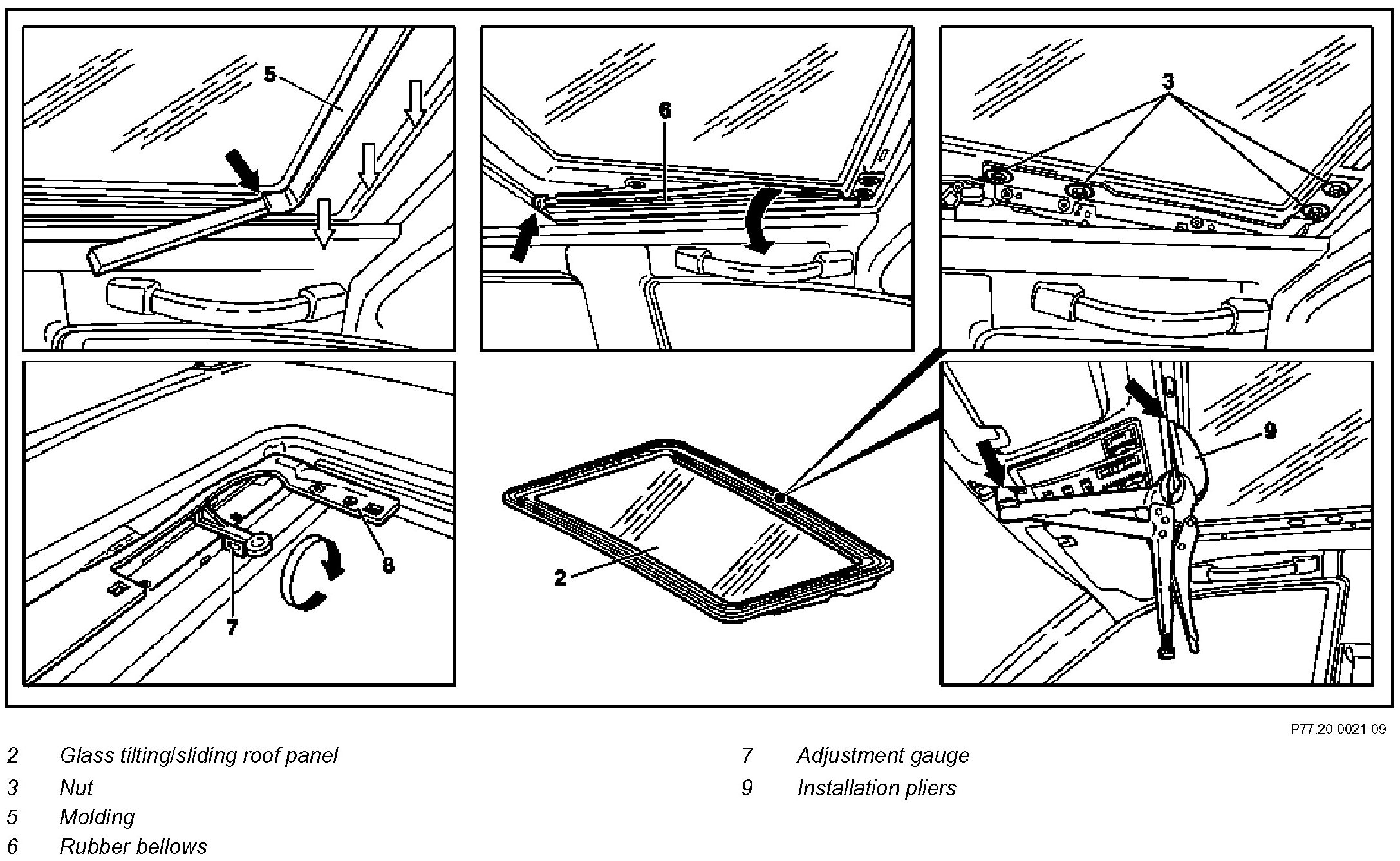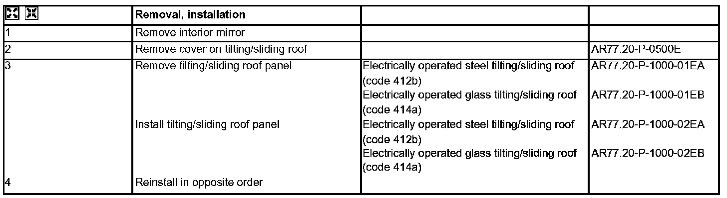 AR77.20-P-1000E Removing And Installing Tilting/Sliding Roof Panel - with CODE (412b) Electric sliding/pop-up roof - with CODE (414a) Electric glass sliding/pop-up roof