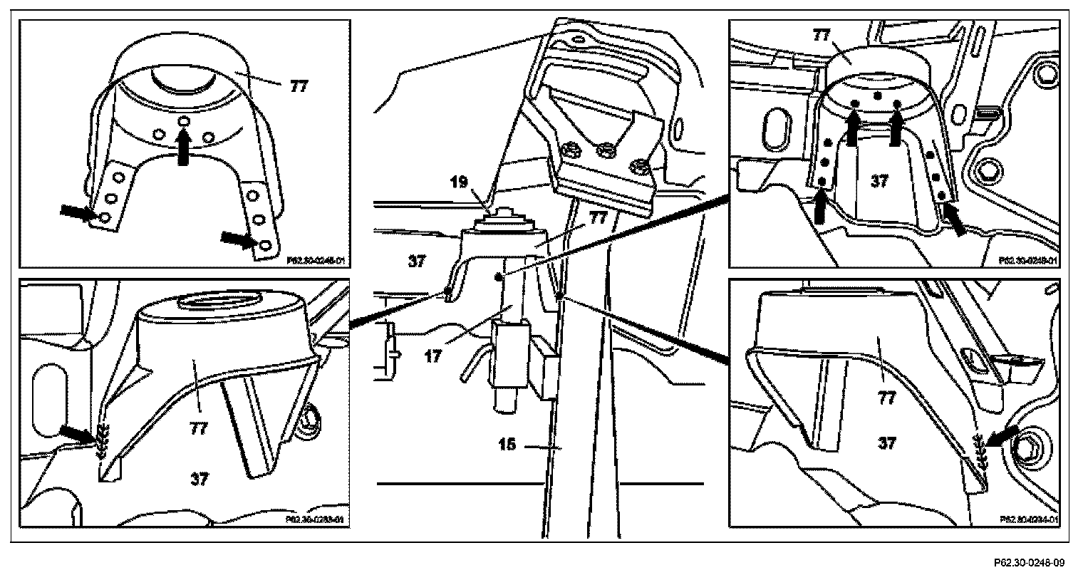2. Punch holes in spot welding flanges for front spring support (77) (9 mm dia., arrows).