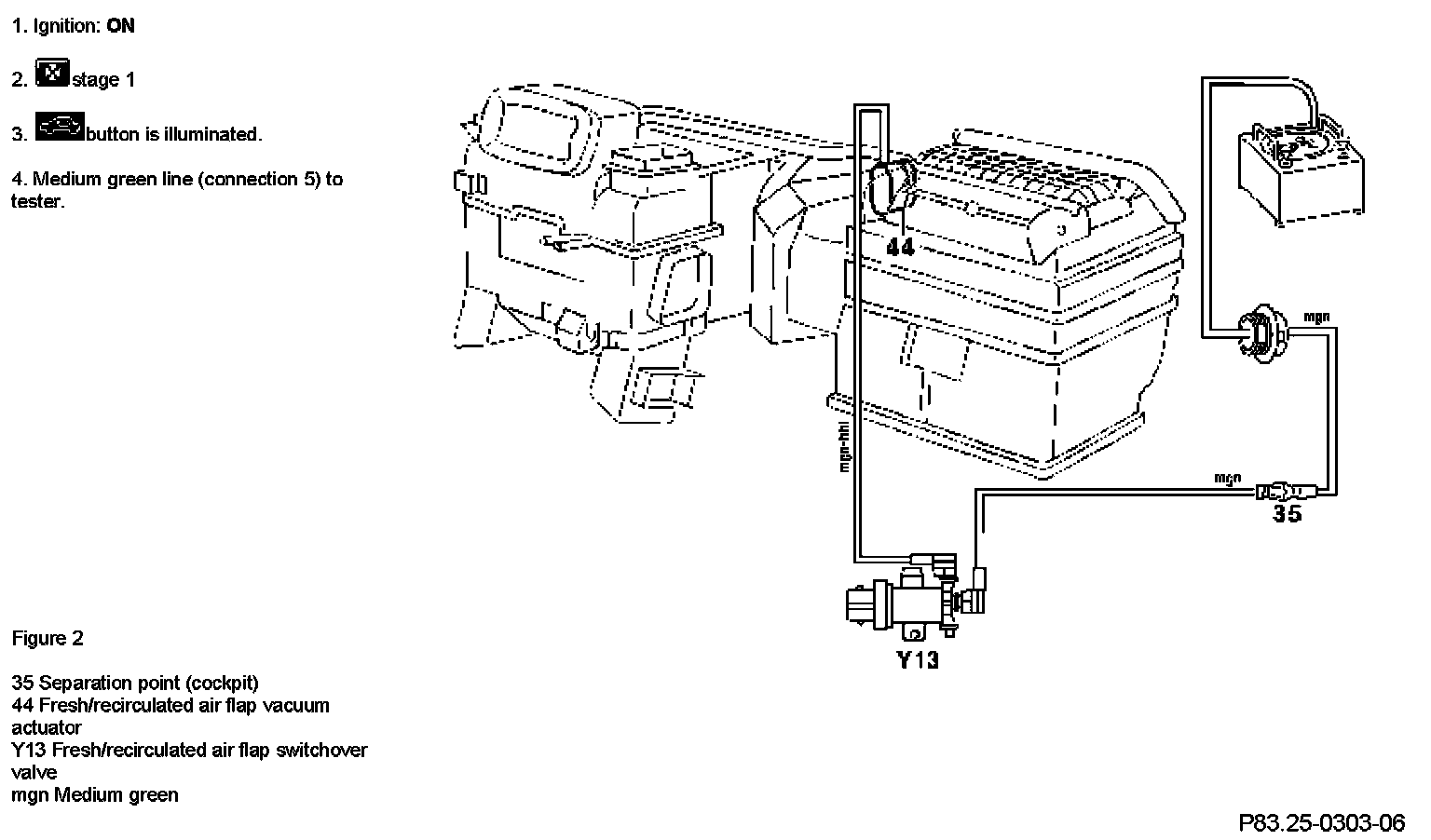 A. Pneumatic Test: Vacuum distribution block, Vacuum Reservoir, Fresh/recirculated Air flap Switchover Valve (Y13)