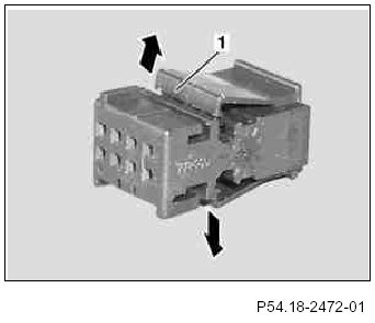14 Press the spring shackle of the female contact (2) downward and push the female contact (2) out of the contact cavity of the connector housing (1). Tug the corresponding cable at the same time to assist the unpinning procedure.