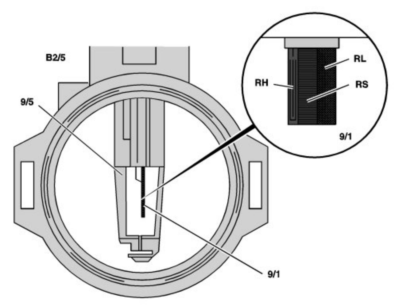 The elecronics in the hot film mass air flow sensor controls the temperature of the heating resistor (RH) by means of a variable voltage so that its temperature is 160°C above the intake air temperature detected by the temperature resistor (RL). The temperature of the heating resistor (RH) is detected by the sensor resistor (RS). If a temperature change occurs as a result of an increased or reduced air flow, the electronics adapts the voltage at the heating resistor (RH) until the temperature difference is again achieved. This control voltage is used by the engine control unit as a measure for the metered air mass.