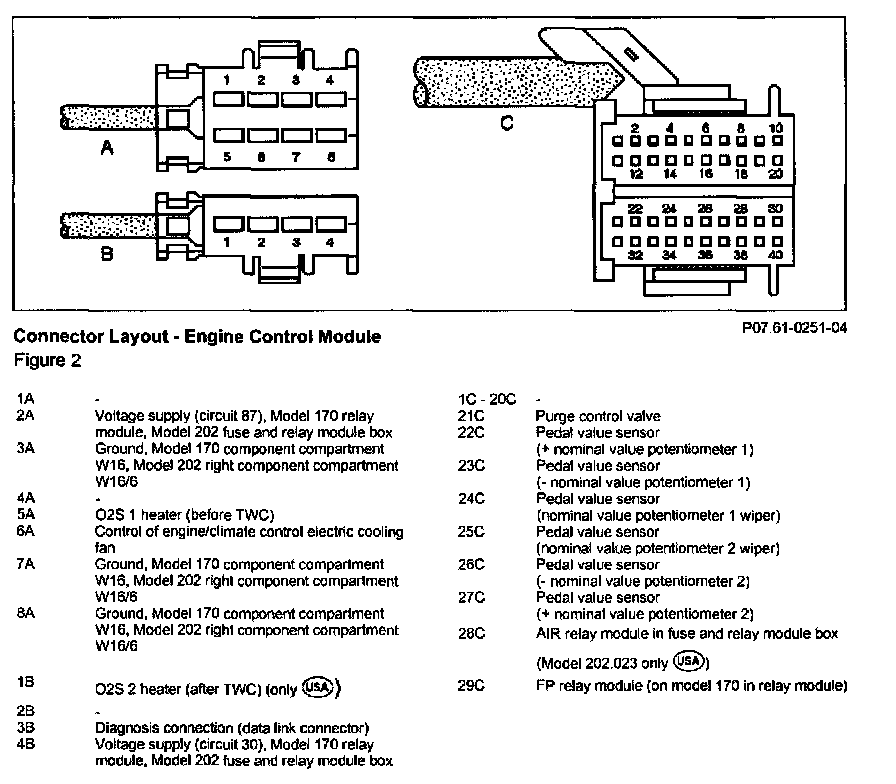 Figure 2 - Connector Layout, ECM Pins (1A - 8A, 1B - 4B, 1C - 29C)