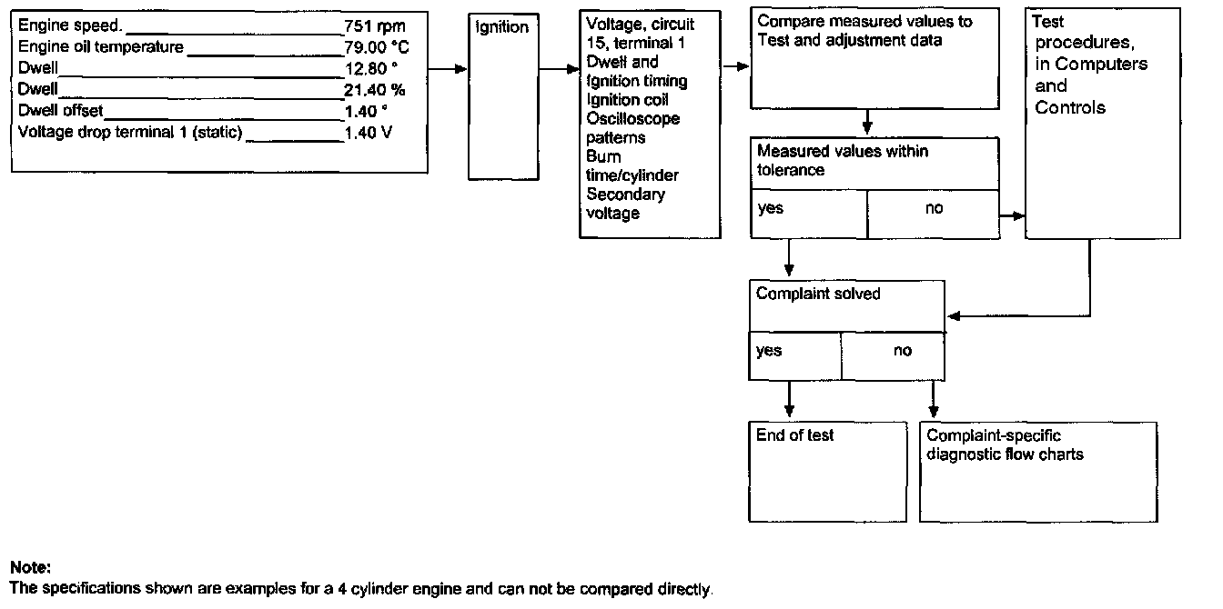 By switching the trigger clamp from cylinder 1 to cylinder 2 on Engine 119, an Ignition timing comparison measurement can be made. Subtract 90° from the indicated measurement value to determine the correct specification. This will show any defects in the segments on the starter ring gear.