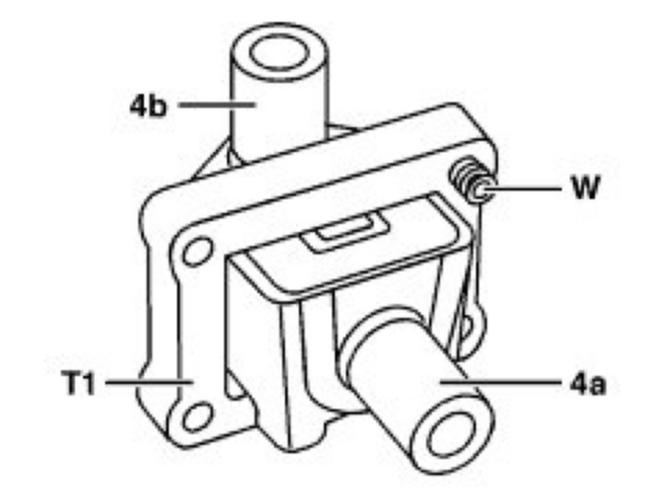 The twin spark ignition coils (T1/1, T1/2, T1/3) are mounted directly onto a spark plug together with a spark plug connector via the secondary output (4a). The secondary output (4b) leads via an ignition cable to the other cylinder. The guide sleeve (W) is at the same time the ground connection for the ignition coil. The voltage is supplied fuse-protected by the ignition/starter switch