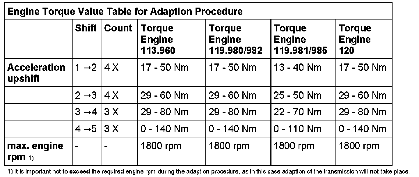 Caution! During the adaption procedure, it is important to maintain the engine torque values as Indicated in the Engine Torque Value Table on the following page.