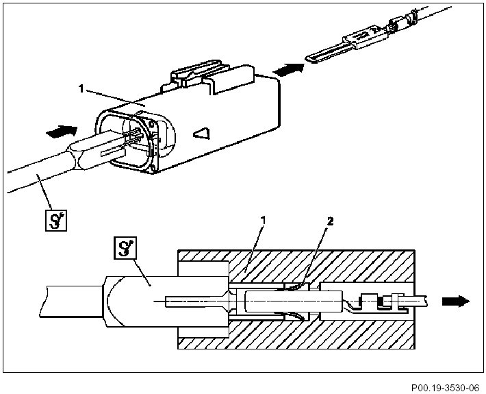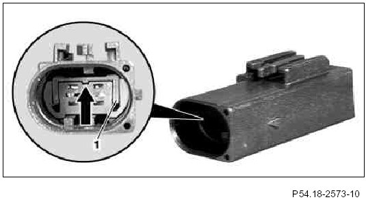1 Using a suitable tool, push tabs of contact retainer (1) direction of arrow out of locked position.