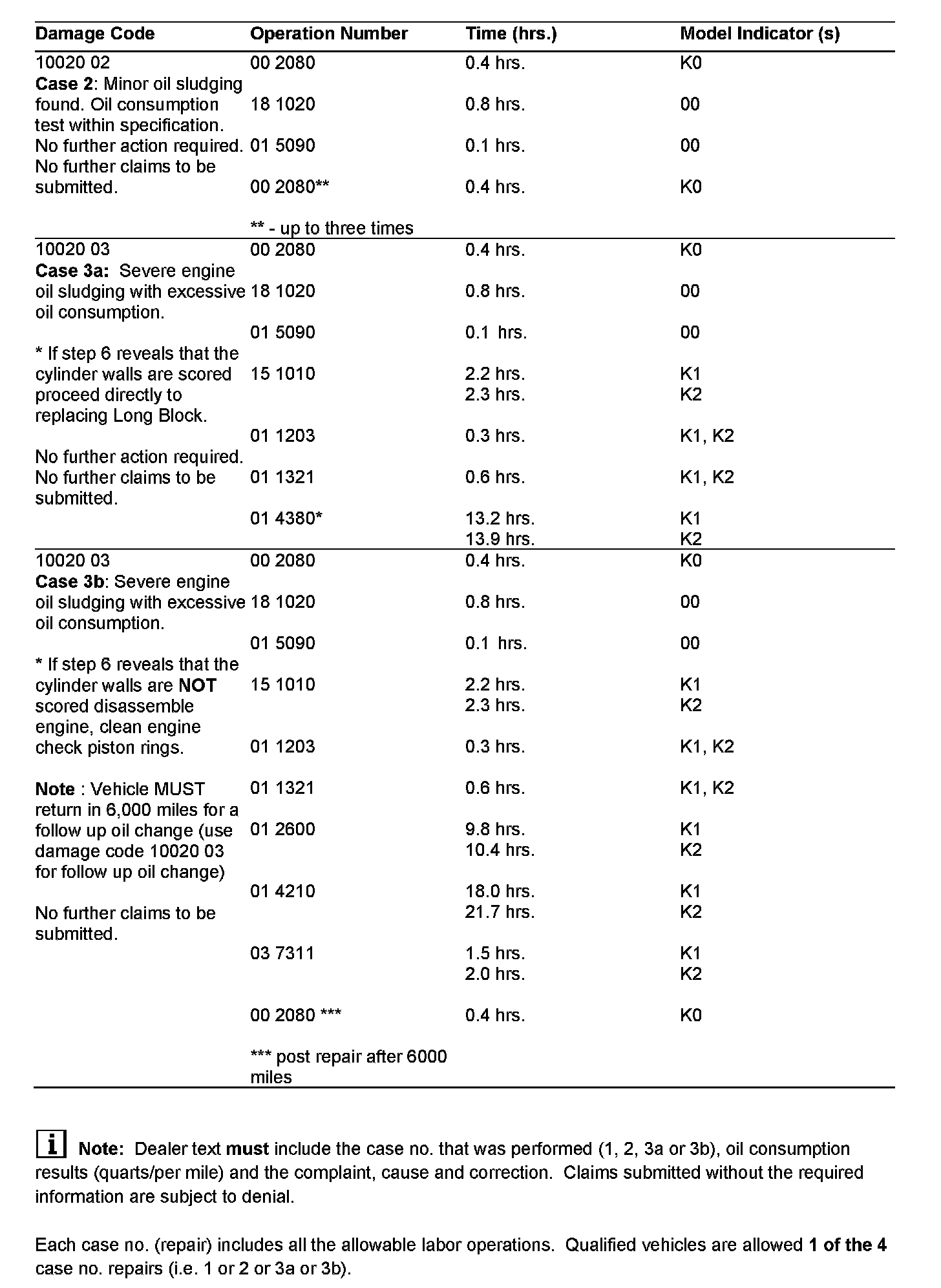 In case of any complaints relating to oil sludging and sludging caused engine damage complaints relating to model year 1998 through model year 2001 (Sold through March 2001). Please also review and comply with O'Keefe Class Action Settlement and Service Guidelines Document available on May 9, 2003.