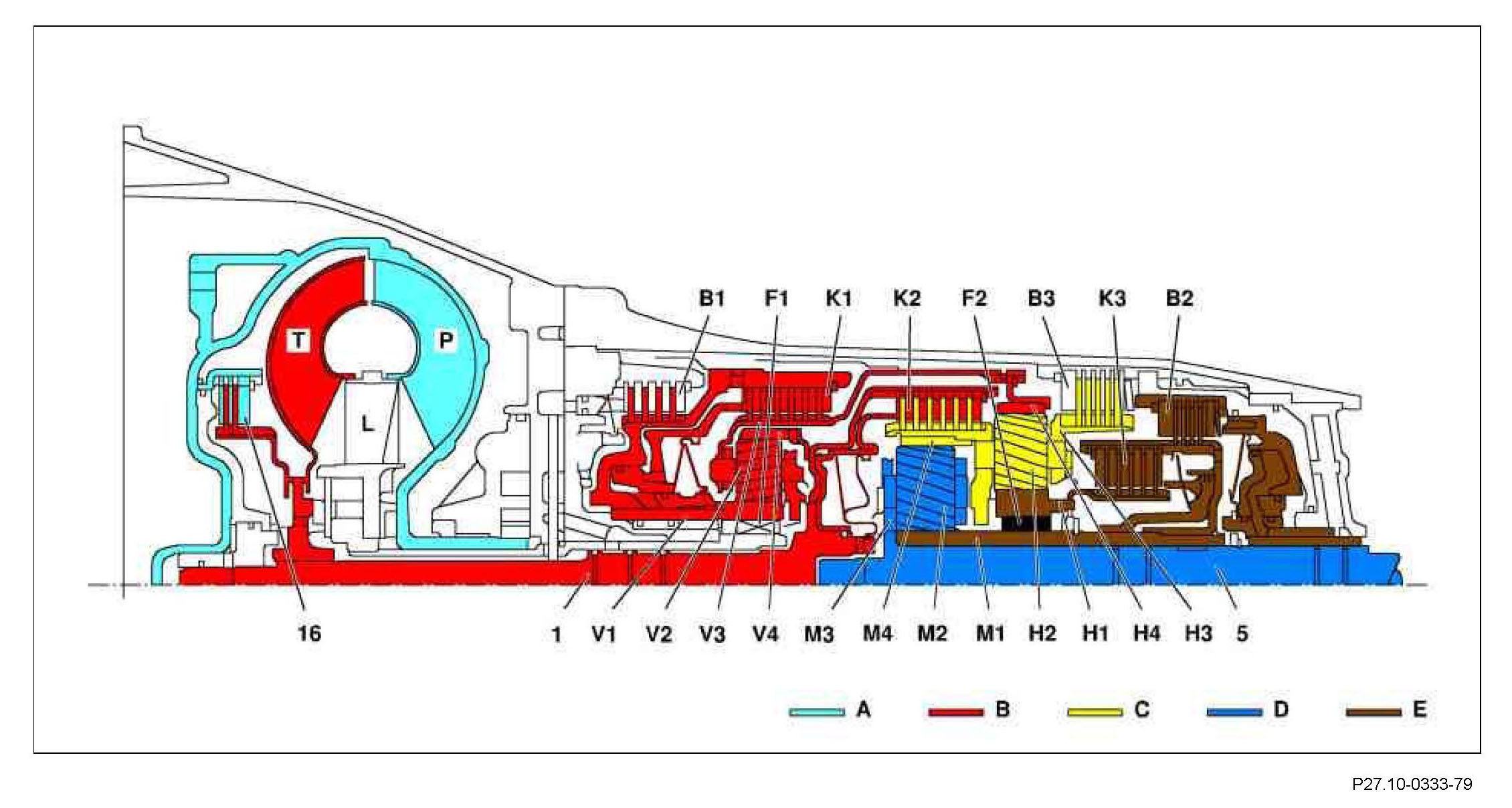 Torque from the torque converter is increased via the propeller shaft (1) and the center and rear planetary gearset and transferred to the output shaft (5).